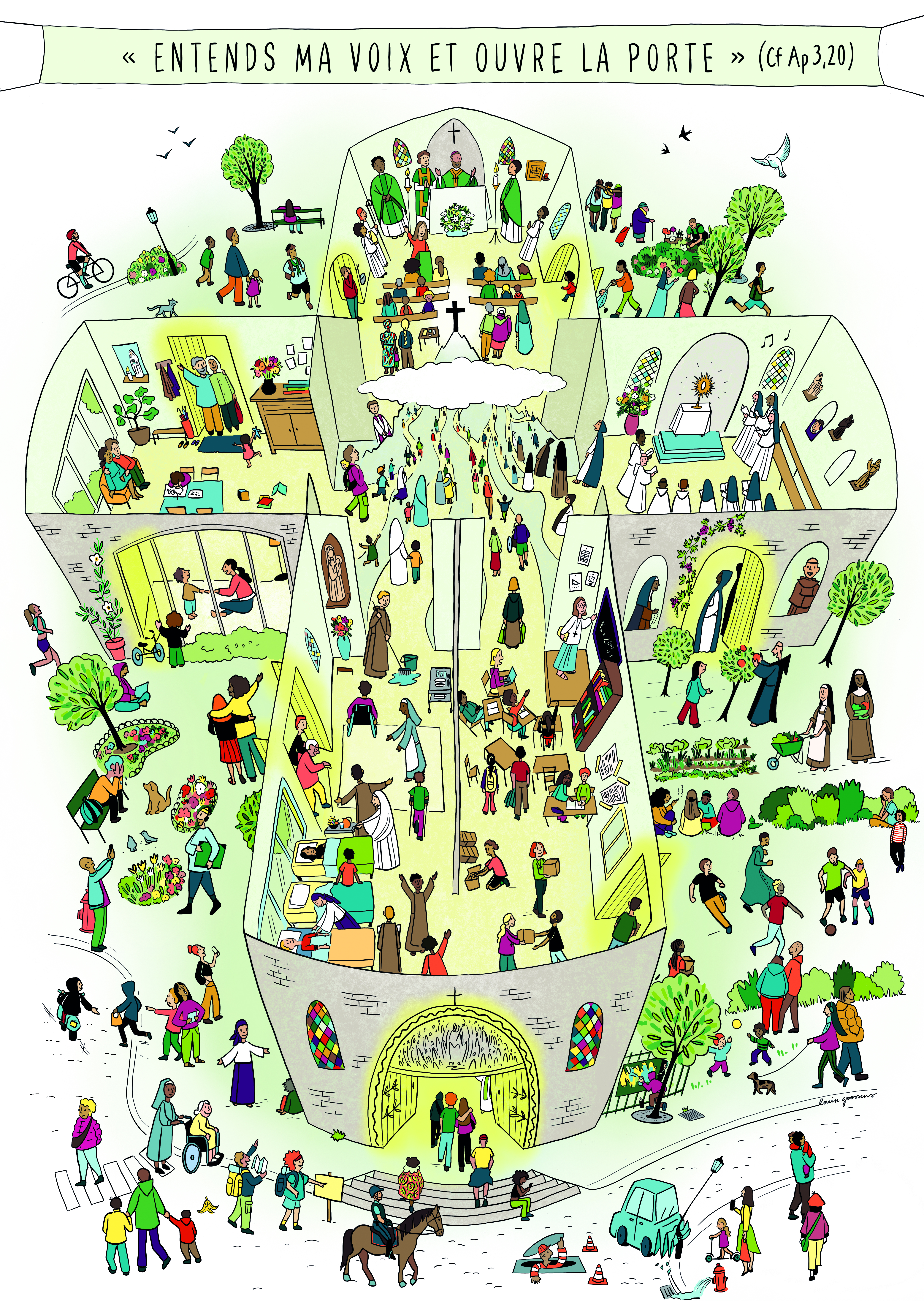 En lien avec l’année jubilaire et le passage de la Porte Sainte, nous vous proposons cette année de passer la porte pour répondre à notre vocation. Sur ce visuel, vous trouverez une grande croix qui représente l’Eglise, la communauté des chrétiens. À chaque extrémité de la croix, des portes s’ouvrent, donnant accès à des pièces symbolisant différentes vocations. Chaque pièce est un espace unique, représentant une vocation particulière, et ces pièces forment la structure de la croix. Ces pièces sont également toutes ouvertes vers le cœur de la croix, symbolisant le fait que chaque vocation interagit avec les autres. Chaque pièce présente une scène animée, avec de petits personnages représentant des réalités et des vocations différentes : les religieux apostoliques, la vie monastique, la famille, la vie sacerdotale, les laïcs consacrés. On peut également voir des petits personnages évoluer autour et au cœur de la croix.