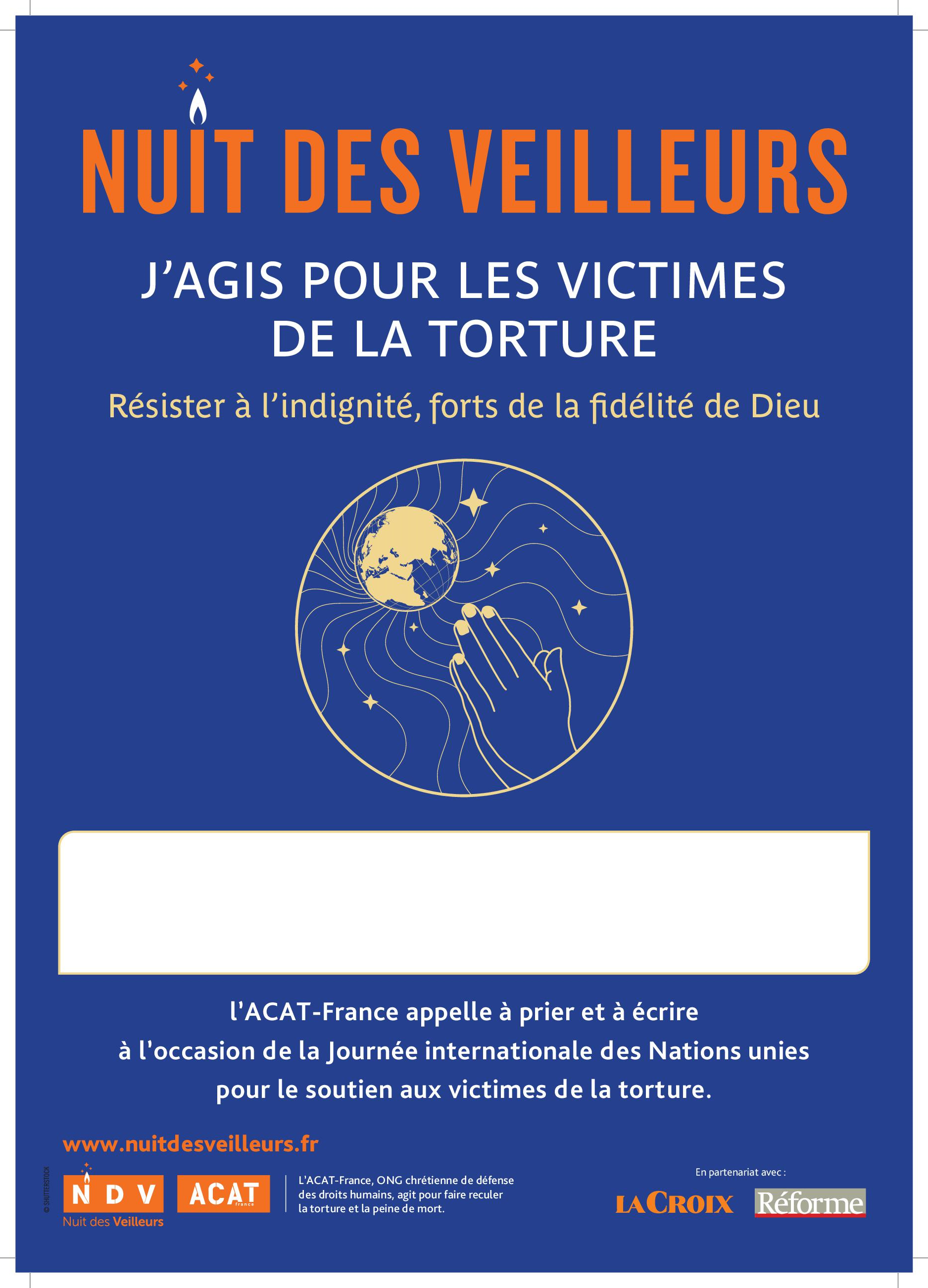 Publié le 10/06/2025Comme chaque année, l’ACAT-France, ONG chrétienne de défense des Droits de l’Homme, organise autour du 26 juin, la Journée internationale des Nations Unies pour le soutien aux victimes de la torture, la Nuit des veilleurs et invite les chrétiens – catholiques, protestants et orthodoxes – les sympathisants de toutes générations, ainsi que toutes les personnes qui disent NON à la torture, à se rassembler afin de prier pour les victimes.