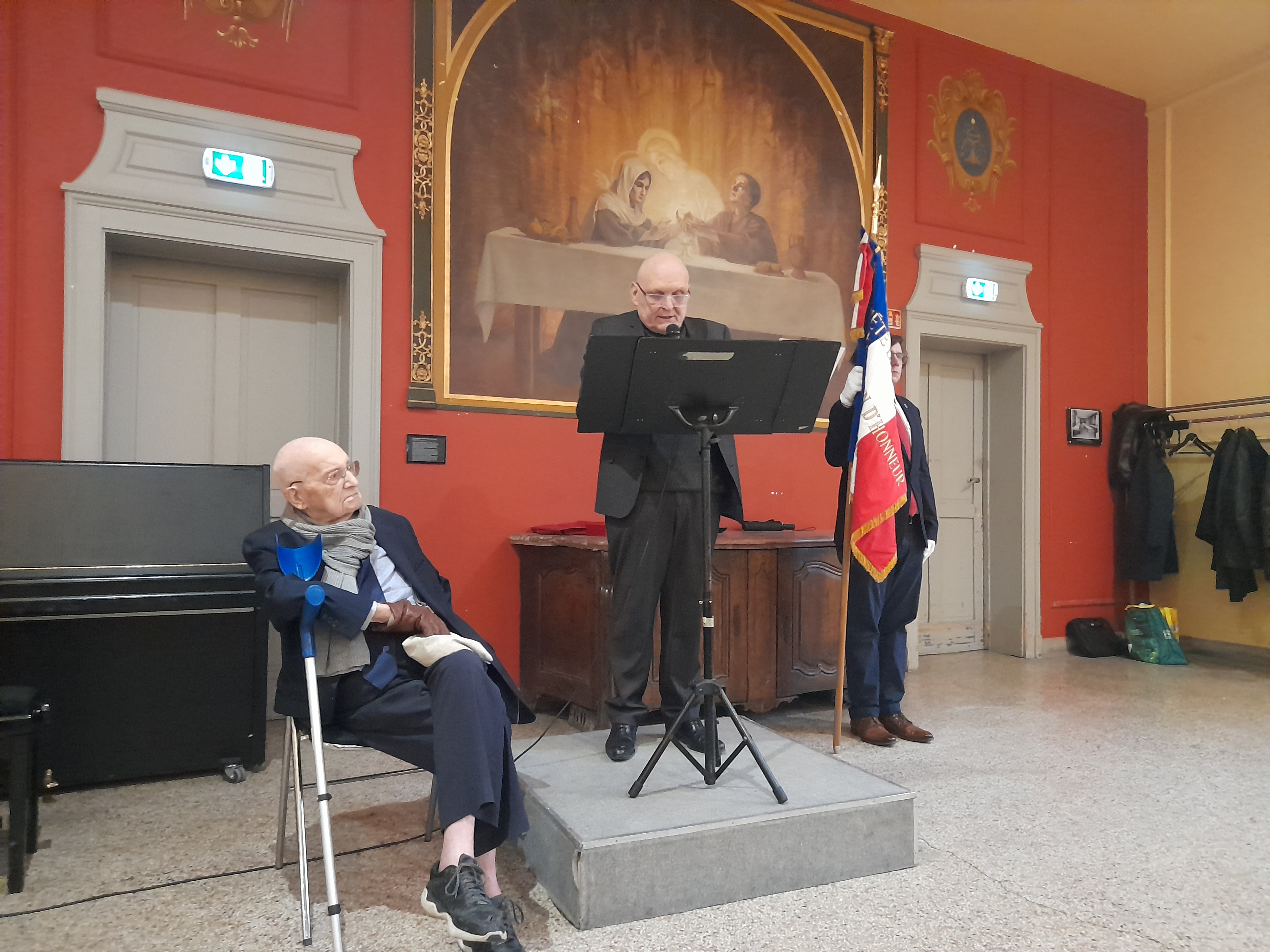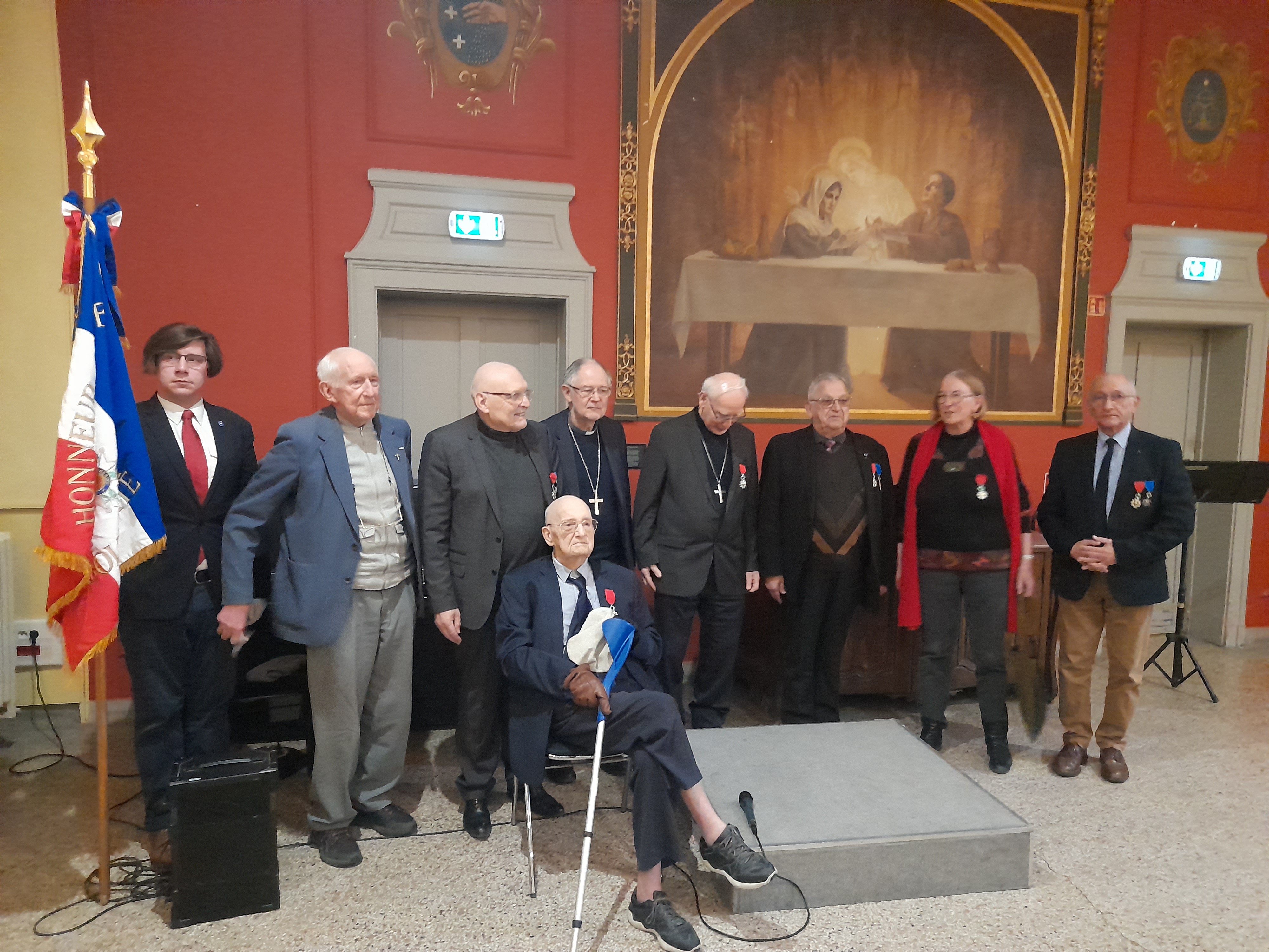 Voilà qu’aujourd’hui, dans votre 102ème année, vous êtes promu dans la distinction le plus prestigieuse et la plus haute de la Nation : l’Ordre de la Légion d’honneur. Instituée par Napoléon-Bonaparte premier consul le 19 mai 1802 cette distinction a vocation à honorer les mérites éminents de ceux de nos concitoyens qui savent se dévouer au service de l’intérêt général et, à ce titre, je cite le décret de création, « ces mérites sont dignes d’être proposés en exemple à toute la Nation. » Pour votre admission dans l’ordre de la Légion d’Honneur, vous avez choisi que la cérémonie républicaine se déroule ici dans ce centre diocésain et qui fait sens par rapport à votre histoire personnelle. Une remise de décoration est nécessairement solennelle, la présence des drapeaux en atteste. Les médailles visibles soulignent le caractère exceptionnel de l’événement Ce faisant, vous avez voulu que la solennité exigée par l’événement soit compatible aussi avec la modestie et l’authenticité qui vous caractérisent. C’est pourquoi, vous avez fait le choix de rassembler ici selon les seuls critères du cœur et du sens que vous donnez à votre vie. En d’autres termes, chers amis, vous n’êtes pas ici dans une réception mondaine. Soyez conscients de votre statut : Seuls sont rassemblés, ici, les proches et les amis du Père Gilles. Vous en êtes.