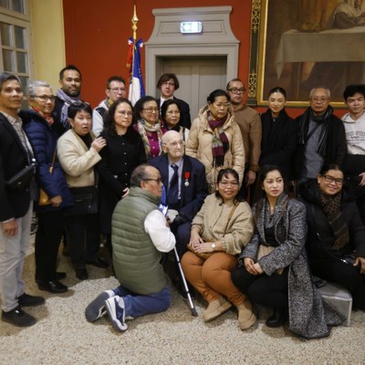 Bien chers amis, je vous en avais prévenu : résumer un parcours de vie, c’est nécessairement une gageure, c’est à coup sûr rétrécir ce qui fait le mouvement ample et généreux d’un engagement conduit au quotidien. Cette vie, votre vie, n’a finalement qu’un fil rouge, à l’instar de ce ruban de LH : aller au-delà de vous-même et faire de tout homme votre prochain et votre frère. Notre quotidien régional, ce matin, titrait « le monde se barricade contre les migrants » En contre point, devant les ambassadeurs accrédités au Vatican, il y a quelques jours, le pape François rappelait « l’exigence de considérer les migrants comme des personnes humaines qui doivent être accueillies, protégées, promues et intégrées tout en soulignant avec force qu’il convenait de s’attaquer aux causes profondes de ces déplacements. » Dans ce contexte de grand danger pour l’avenir de l’humanité, votre parole, votre action, votre témoignage de vie reste une lampe allumée. Au sens strict du décret napoléonien, votre vie est un exemple pour nous tous. C’est pourquoi votre famille, votre Église, vos amis et tous les Francs-comtois sont fiers de vous. Au-delà, votre nom résonne pour longtemps encore dans ces lointaines contrées d’Asie qui n’oublient rien. Votre héritage ne mourra pas.