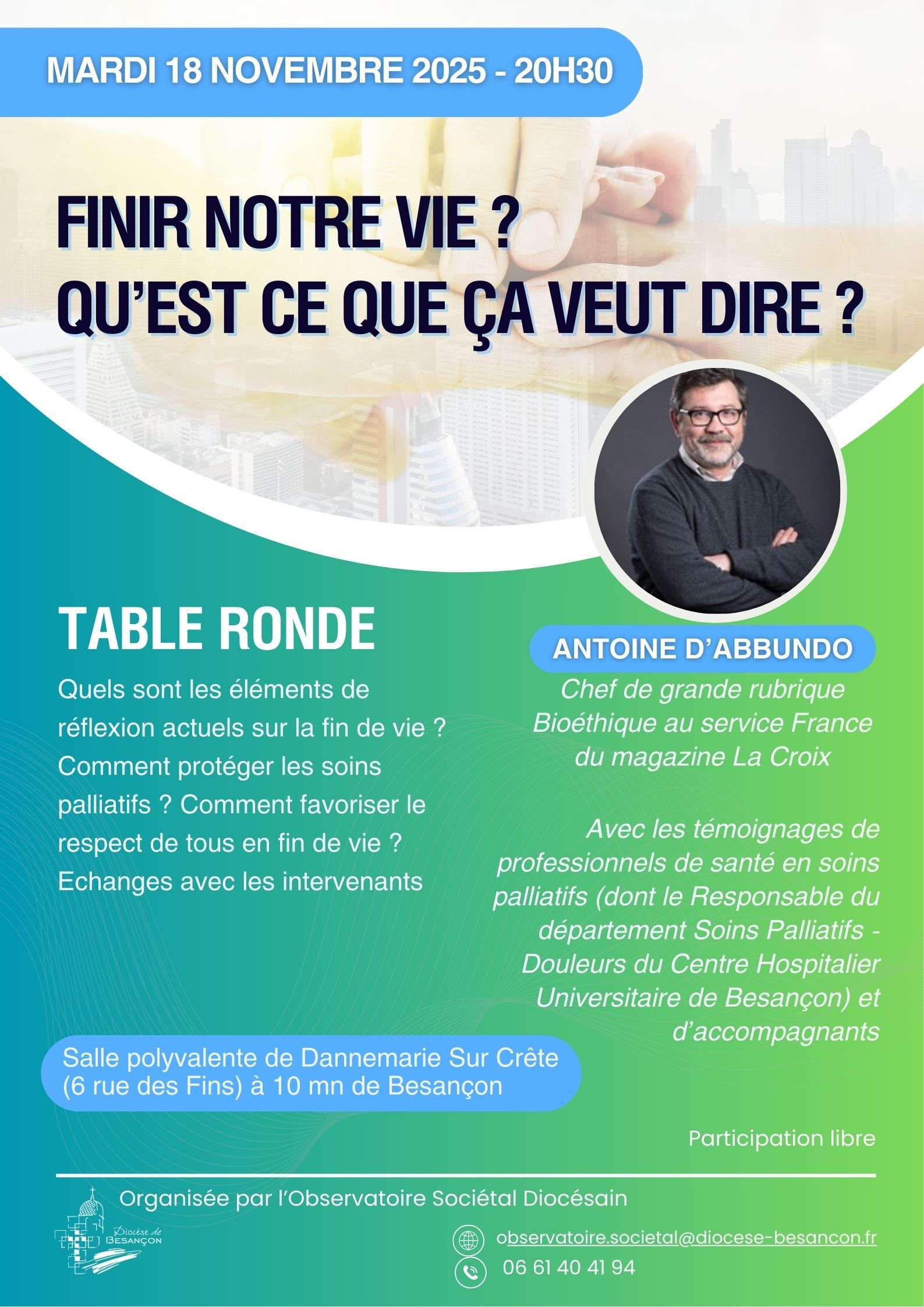 Une table ronde réunira autour d'Antoine d’Abbundo (Chef de grande rubrique Bioéthique du magazine La Croix) les témoignages de professionnels de santé en soins palliatifs (dont le Responsable du département Soins Palliatifs - Douleurs du Centre Hospitalier Universitaire de Besançon) et d’accompagnants. Un temps d'échange avec la salle favorisera les interactions.
